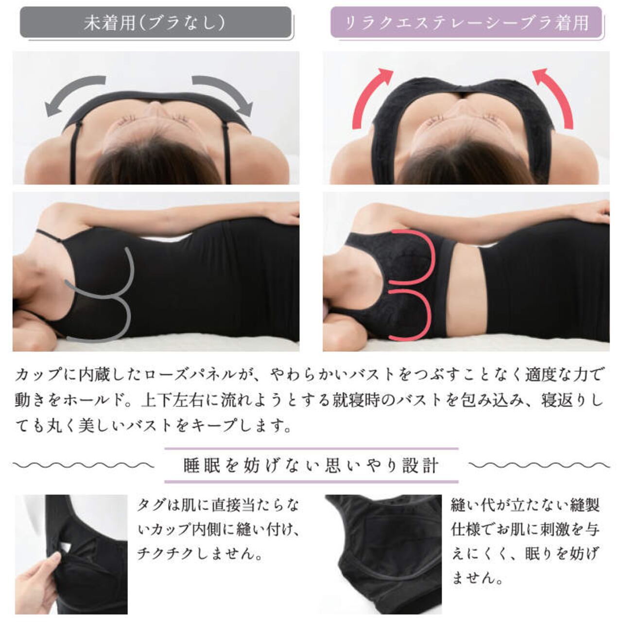 寝ている間の流れやすいバストを360度ホールドし、寝返りをしてもしっかり丸く美しいバストをキープ。