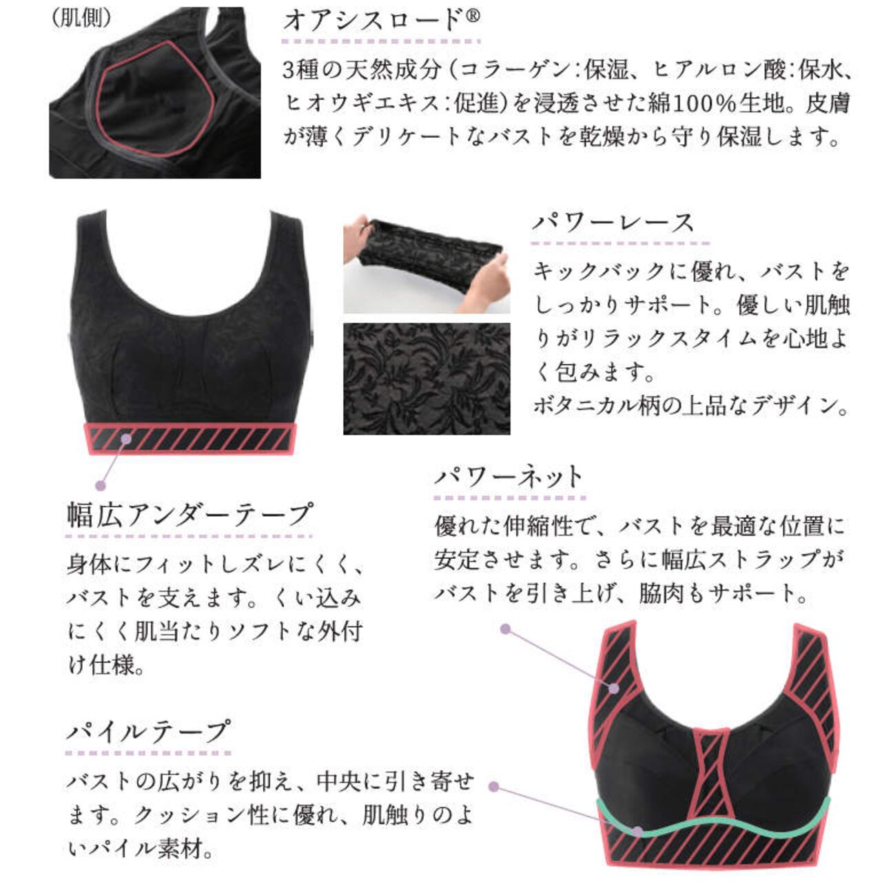 寝ている間にも形が崩れるバストを独自開発ローズパネル構造で、就寝時もしっかりホールド&キープ。